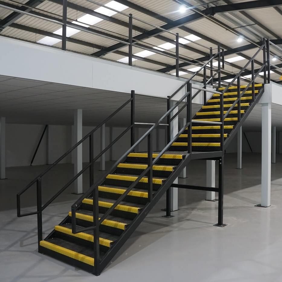 Mezzanine stairs are purpose-designed staircases that provide safe access between ground level and mezzanine floors in industrial and commercial buildings. They are commonly used in warehouses, factories, workshops and offices where additional usable space has been created within an existing structure.